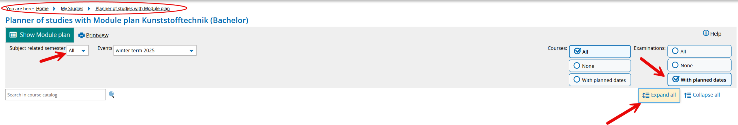 Planner of studies with Module plan: Select – All – for Subject related semester (at left top left under Show Module plan – at top right at Examinations: select „With planned dates“ and and “Expand all” below - you should then see the possible exam registrations (Apply).