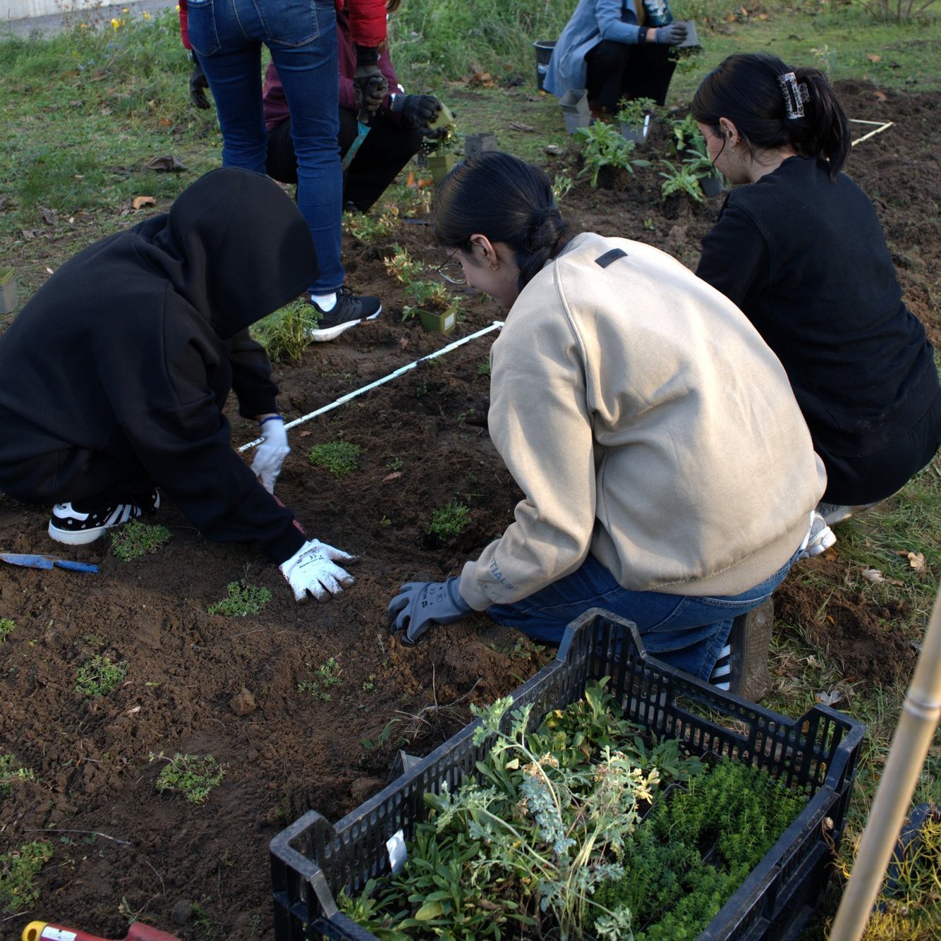 Im April 2023 haben als erste Aktion eine Gruppe Freiwilliger aus Studierenden und Mitarbeitenden der h_da die Grünfläche vor der Mensa in ein Kräuter- und Staudenbeet umgewandelt. Hierfür trafen Sie sich an einem Samstag, um die Fläche umzugraben und Kräuter und Stauden zu setzen. In dem Beet befinden sich nun beispielsweise Ringelblumen, Thymian- und Lavendelpflanzen, die Bienen und anderen Insekten als Nahrung dienen. Mehr Informationen zu diesem Projekt und der dortigen Bepflanzung finden Sie hier.
