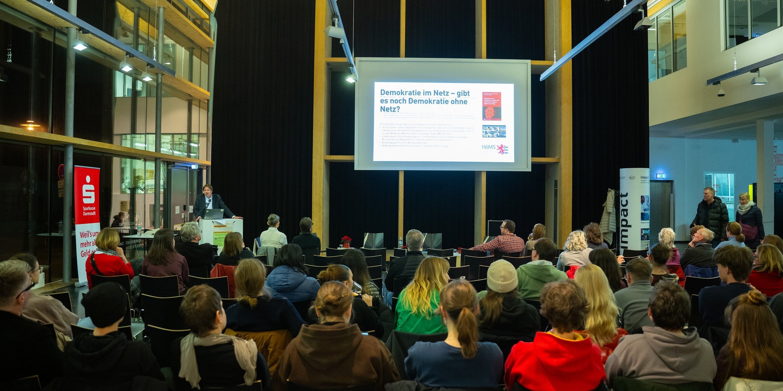 „Demokratie im Netz: Zwischen Desinformation und Technophobie“ – dieses Thema lockte am 4. Dezember 2025 immerhin rund 60 Gäste ins Foyer des Fachbereichs Gestaltung. In zwei Impulsvorträgen und einer von Marion Kuchenny moderierten Podiumsdiskussion ging es unter anderem um Fake News, Polarisierung und Extremismus im Netz – aber auch um konstruktive Ansätze und Angebote, die die Situation verbessern können.
