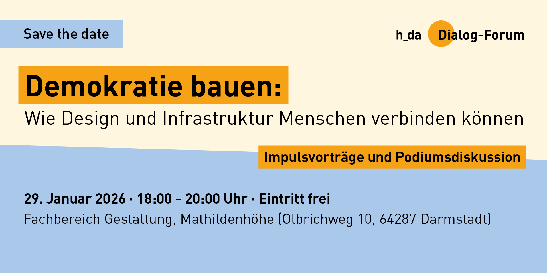 2026 setzen zwei weitere h_da Dialog-Foren die Reihe unter dem Motto „Demokratie gestalten“ fort. „Demokratie bauen: Wie Design und Infrastruktur Menschen verbinden können“ lautet die Überschrift am 29. Januar. Die Anmeldung ist bereits über diesen Link möglich.
