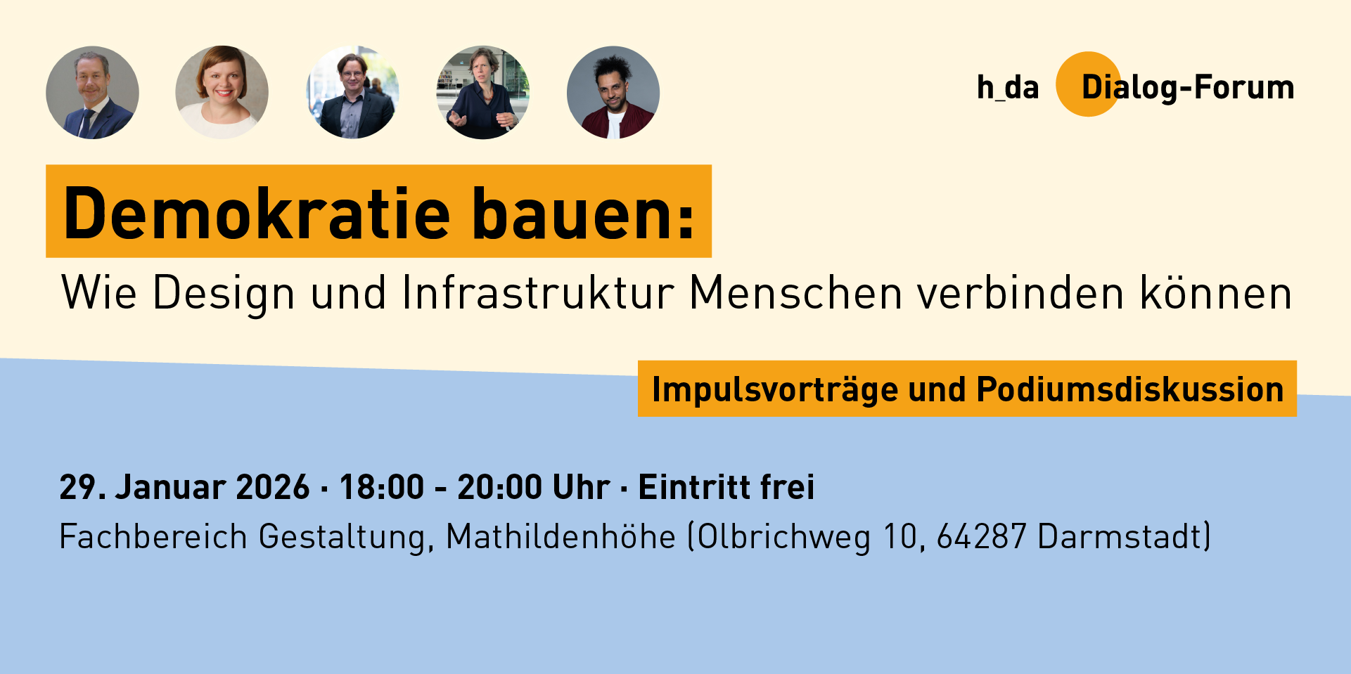 „Demokratie bauen: Wie Design und Infrastruktur Menschen verbinden können“ – diese Überschrift haben wir dem siebten h_da Dialog-Forum gegeben. Am 29. Januar ab 18 Uhr geht es am Fachbereich Gestaltung auf der Mathildenhöhe unter anderem um diese Fragen: Was sagt die Qualität der Infrastruktur über den Zustand der Demokratie aus? Wann wirkt gebaute Umwelt inklusiv und beteiligungsfördernd, wann ausgrenzend? Wie lässt sich das stadtplanerisch beeinflussen?