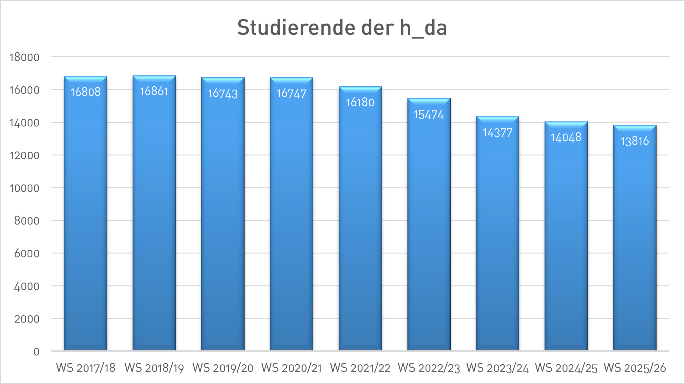 Im aktuellen WS 2025/26 hat die h_da 13.816 Studierende und 89 Beurlaubte.