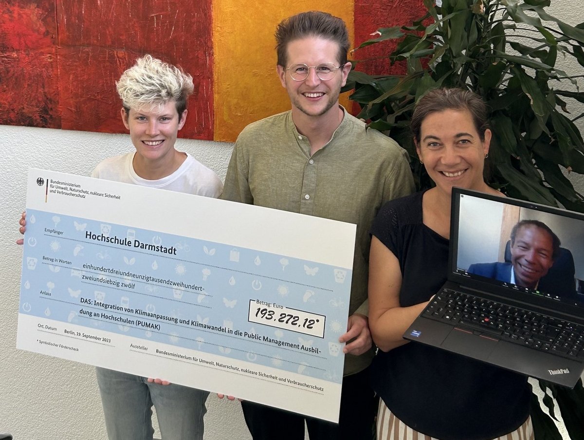 Der Studiengang Public Management der Hochschule Darmstadt stärkt den Aufbau von Kompetenzen zu Klimaanpassung in der öffentlichen Ausbildung. Christian Kühn, Parlamentarischer Staatssekretär im Bundesumweltministerium, hat hierzu heute einen Förderbescheid an die h_da überreicht. Mit Fördermitteln in Höhe von 193.000 Euro aus der Förderrichtlinie „Maßnahmen zur Anpassung an die Folgen des Klimawandels“ will der Studiengang nun neue Standardmodule zum Thema Klimafolgenanpassung entwickeln. Ziel ist es, den Kompetenzerwerb im Bereich Klimawandel und Klimafolgenanpassung in der hochschulischen Grundlagenausbildung von Beschäftigten im öffentlichen Sektor zu verankern.