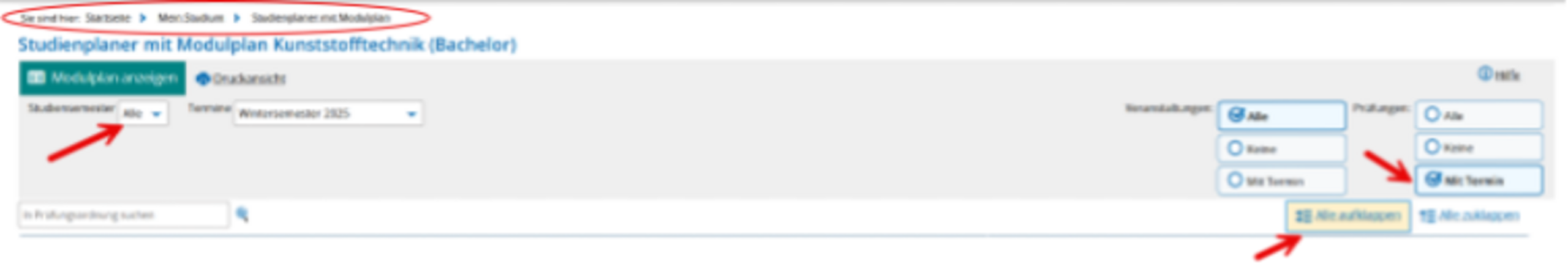 Studienplaner mit Modulplan: Auswahl bei Studiensemester- Alle - (oben link under Modulplan anzeigen) - und rechts oben bei Prüfungen "Mit Termin" und darunter - Alle aufklappen - dann sollten Sie die möglichen Prüfungsanmeldungen sehen.